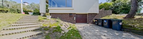 De voortuin heeft een niveauverschil richting de entree van de woning. Er is een oprit met plek voor 2 auto’s voor de garage waar ook 2 auto’s kunnen staan. Er is een elektrisch laadpunt voor elektrische auto’s. Aan de linkerzijde van de voortuin is een pad omhoog richting het entree en hier kan je ook doorlopen naar de achterzijde van de woning waar een zijentree is naar de bijkeuken. Naast het entree is ook een trap naar beneden richting het souterrain.