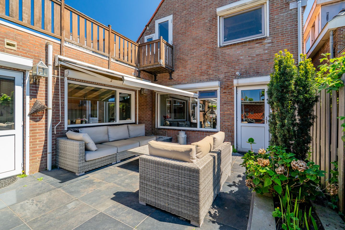 De achtertuin met achterom (recht van overpad) ligt op het noordwesten en is bereikbaar vanaf de keuken of de bijkeuken. Ook is er een wenteltrap richting het grote dakterras. De tuin is voorzien van bestrating, een vaste plantenbak, een stenen berging en een groot zonnescherm.