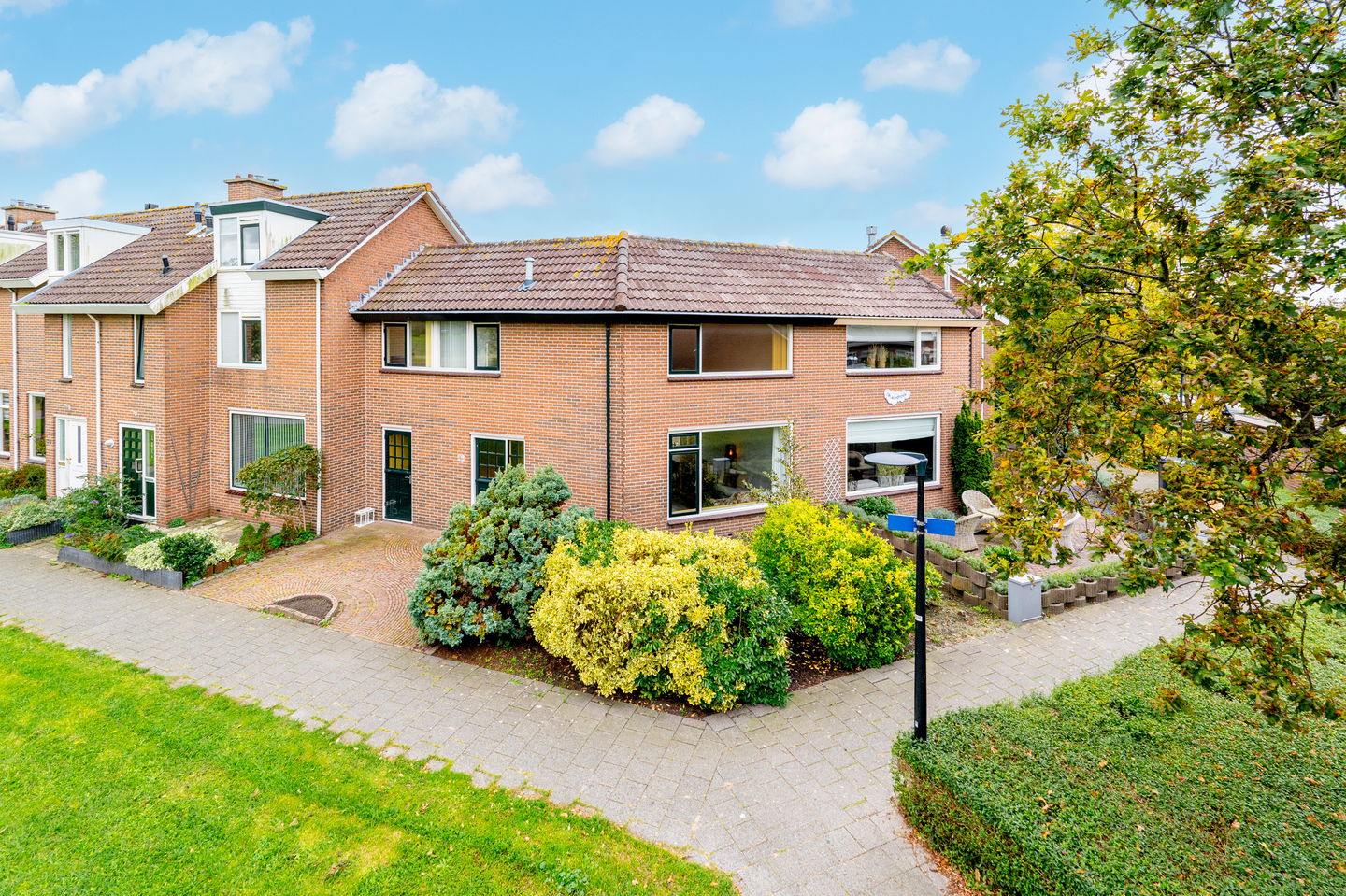 De voortuin volgt de hoek van de woning en biedt een fraai uitzicht op het noordoosten. Via de entree komt u in de hal met garderoberuimte, een toilet met fonteintje, en de trap naar de eerste verdieping. De lichte, doorzon-woonkamer strekt zich uit over de volledige lengte van de woning en heeft grote raampartijen aan beide zijden. De halfopen keuken is uitgerust met inbouwapparatuur, zoals een 4-pits gasfornuis, afzuigkap, vaatwasser en koelvriescombinatie. Vanuit de keuken heeft u toegang tot de zonnige achtertuin (zuidwesten) en de bijkeuken met meterkast.
