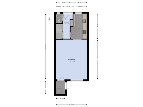 - 63 m² (14,00 meter diep en 4,50 meter breed)