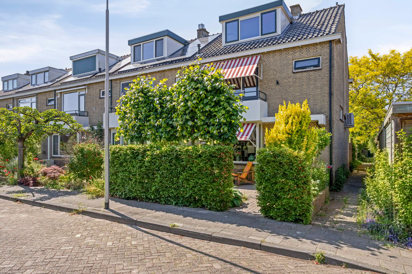 Balkon 1e verdieping, zonneschermen aan de voorzijde van de woning, airco, warmtepomp met airco, tuin op het noordwesten, 2 dakkapellen, 5 slaapkamers.