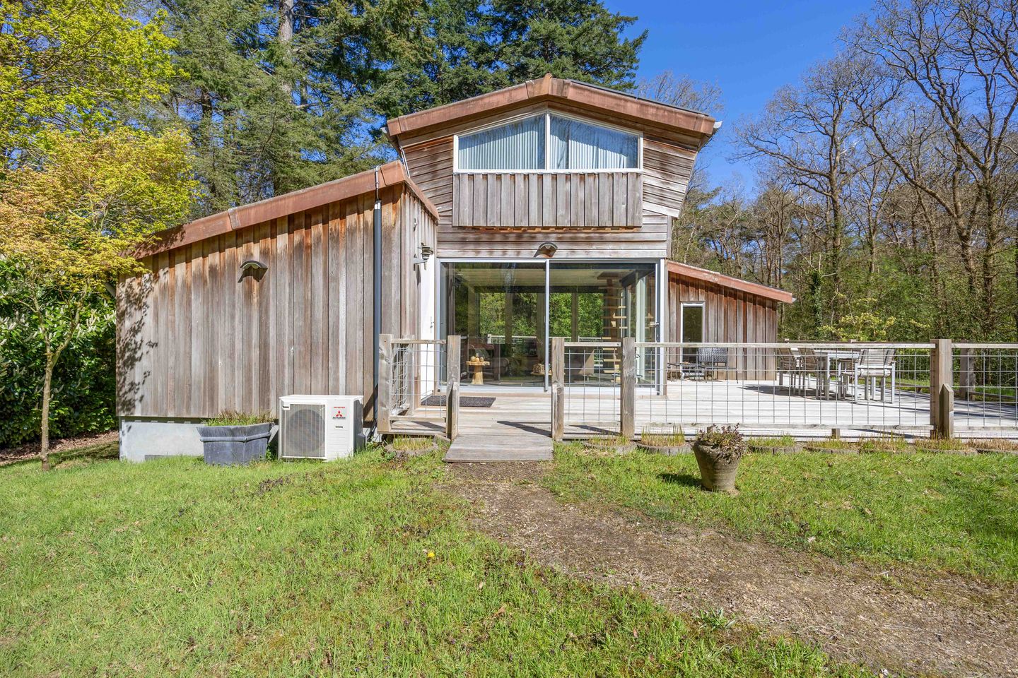 Wederom een slimmigheidje van de architect, want daardoor worden dit soort noodzakelijke, maar niet altijd aantrekkelijke woonbenodigdheden aan het zicht onttrokken. Hetzelfde geldt voor de ruime parkeerplaats, direct bij de oprit van het terrein. Deze wordt afgeschermd door een dichte houtwal. De aandacht blijft daardoor gericht op de met cederhout afgewerkte woning die opgaat in de natuurlijke omgeving. Slechts één ander object trekt de aandacht en dat is het fraai vormgegeven prieel in Aziatische stijl.