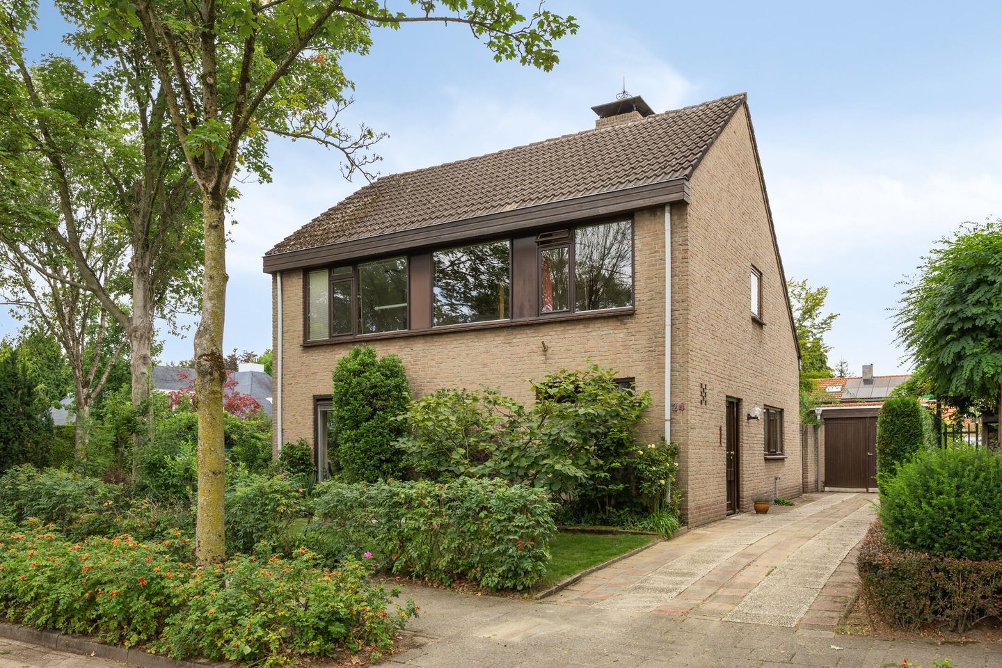 De voortuin van deze woning is groen, verzorgd en biedt een prettige eerste indruk. De straat heeft een ruime opzet, heeft hoge bomen en veel volwassen groen in zowel de tuin als de omgeving. De diepe oprit loopt langs de zijkant van de woning en biedt plaats aan meerdere auto’s. Aan het einde van de oprit bevindt zich de garage, die zowel van buitenaf als via de tuin goed bereikbaar is.