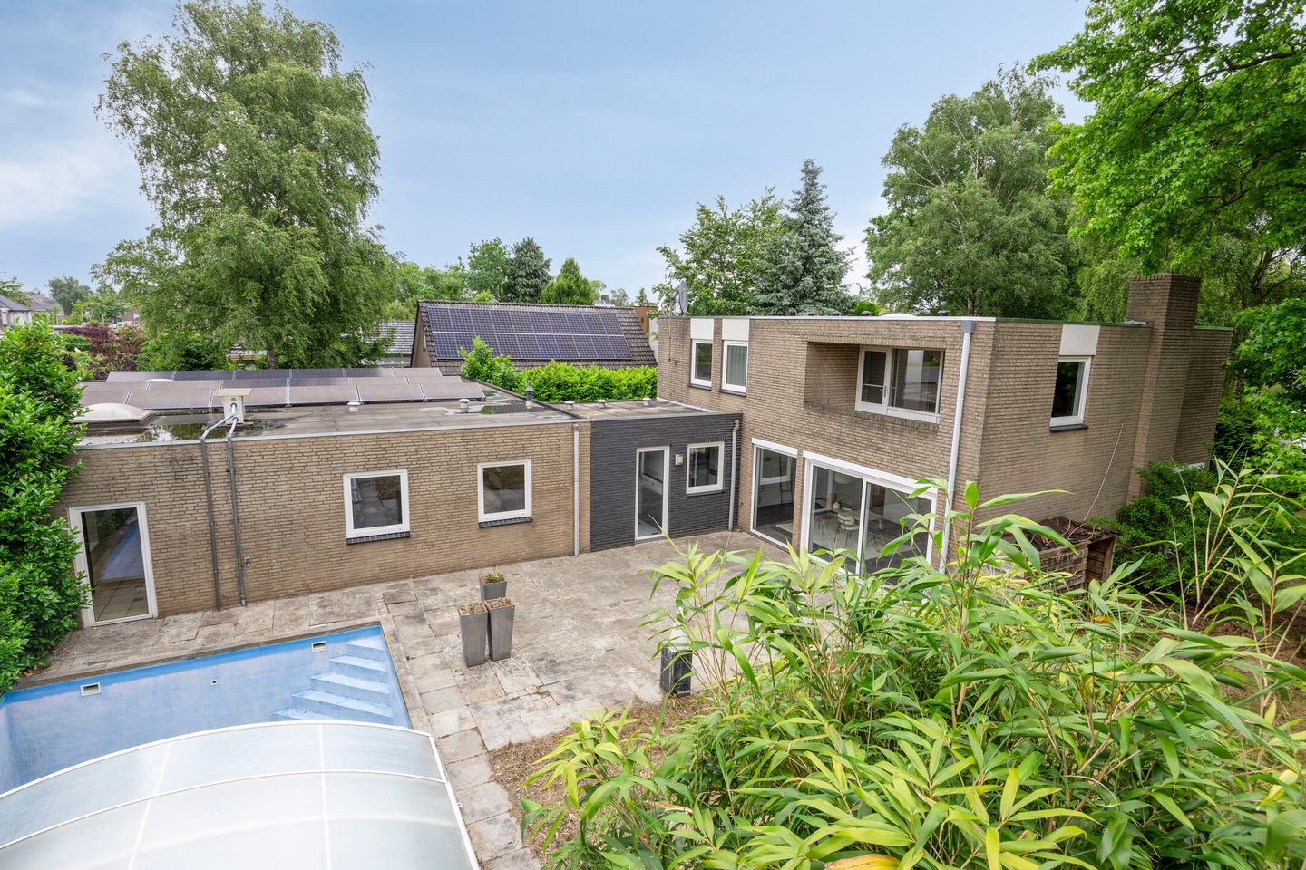 - Glasvezelkabel, mechanische ventilatie, natuurlijke ventilatie, rookkanaal, sauna, schuifpui, zonnepanelen, en zwembad