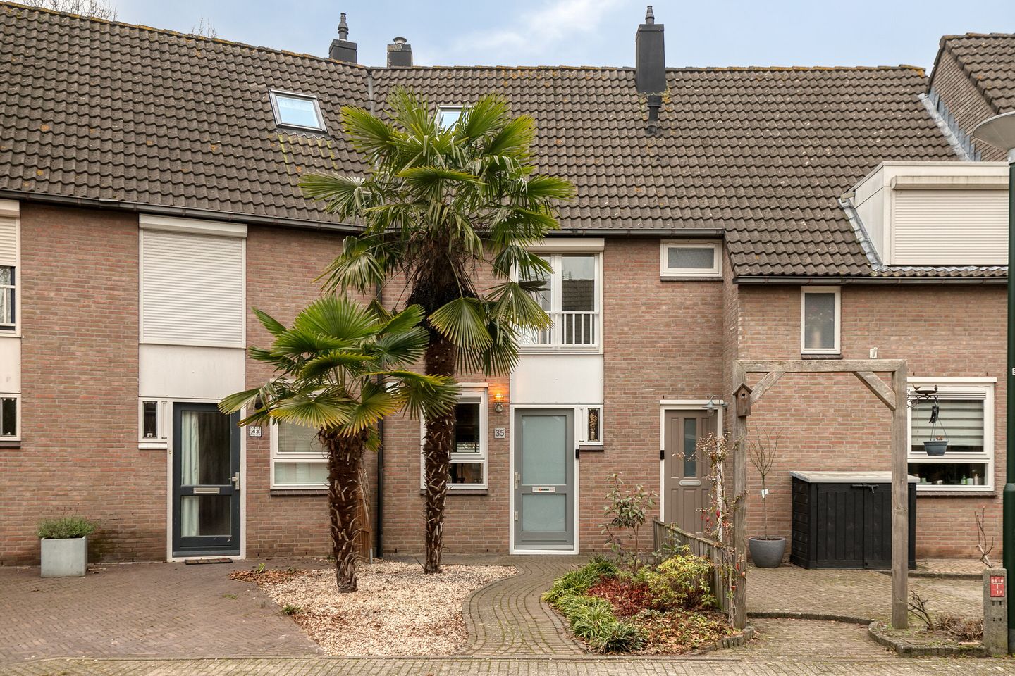 De voortuin is strak aangelegd met witte siersteen, plantenborder en looppad en wordt extra fraai aangekleed door twee volwassen palmbomen.