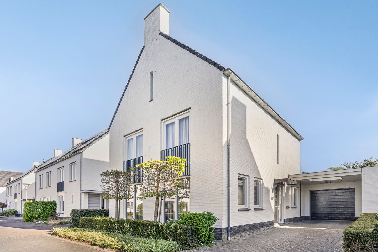 De oprit biedt ruimte voor meerdere auto's en er is een praktische carport met garage. Aan de voorzijde zijn diverse hagen en bomen aanwezig.