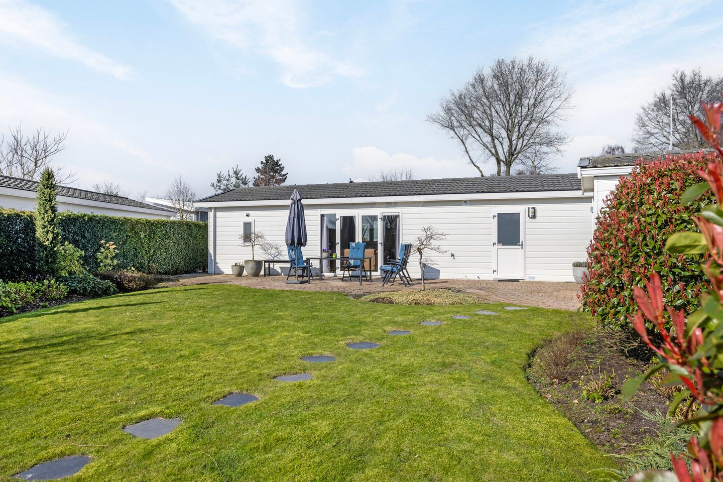 De tuin is professioneel aangelegd en heeft een verzorgde afwerking. Groenblijvende haagbeplanting worden afgewisseld met een gazon en twee ruime zonterrassen. In de borders is beplanting aanwezig wat afwisselend in bloei komt zodat u hier het hele jaar van kunt genieten. De twee terrassen zorgen voor veel zitmogelijkheden om heerlijk te ontspannen en bijvoorbeeld weg te duiken in een goed boek. Eén terras bevindt zich achter in de tuin, waar u heerlijk kunt genieten van de zon en uitkijkt over het water. Het andere ruime terras is direct gelegen voor het chalet. Daarnaast bevindt zich aan het water een ruime vlonder/steiger waar de visliefhebber prima zijn hengeltje kan uitgooien. De berging is naast het chalet geplaatst en is ruim genoeg voor het stallen van de wasapparatuur, uw fietsen of het opbergen van tuingereedschap.