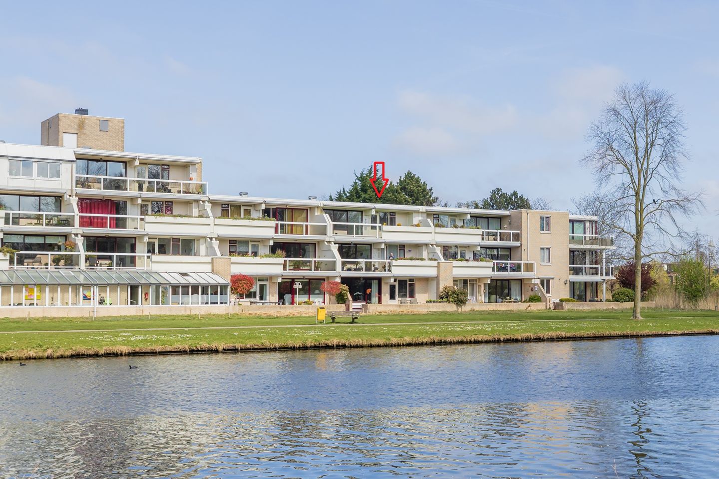 ‘Licht, rust en een uniek uitzicht aan het water vanaf het prachtig brede balkon van dit 3-kamerappartement in Oegstgeest’