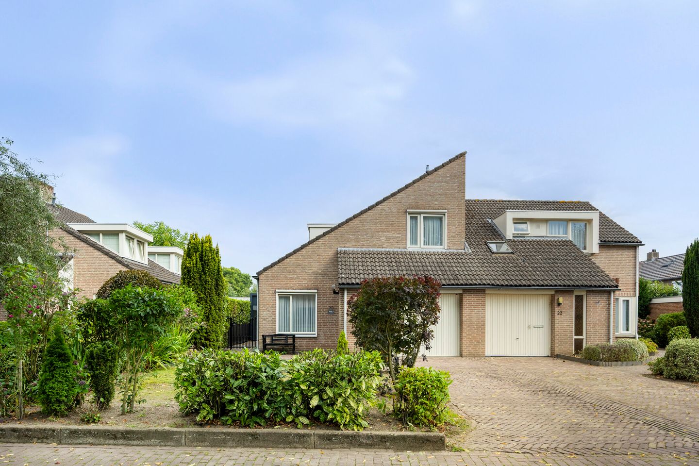 De ontsluiting naar de voortuin verloopt allereerst via een glazen schuifpaneel nabij de achtergevel en vervolgens via stalen sierhekwerk. De ruime voortuin is wederom goed onderhouden. De inrichting met klinkerbestrating, borders met vaste beplanting en gazon straalt verzorging uit en de oprit biedt comfortabel plaats aan twee auto's op eigen terrein.