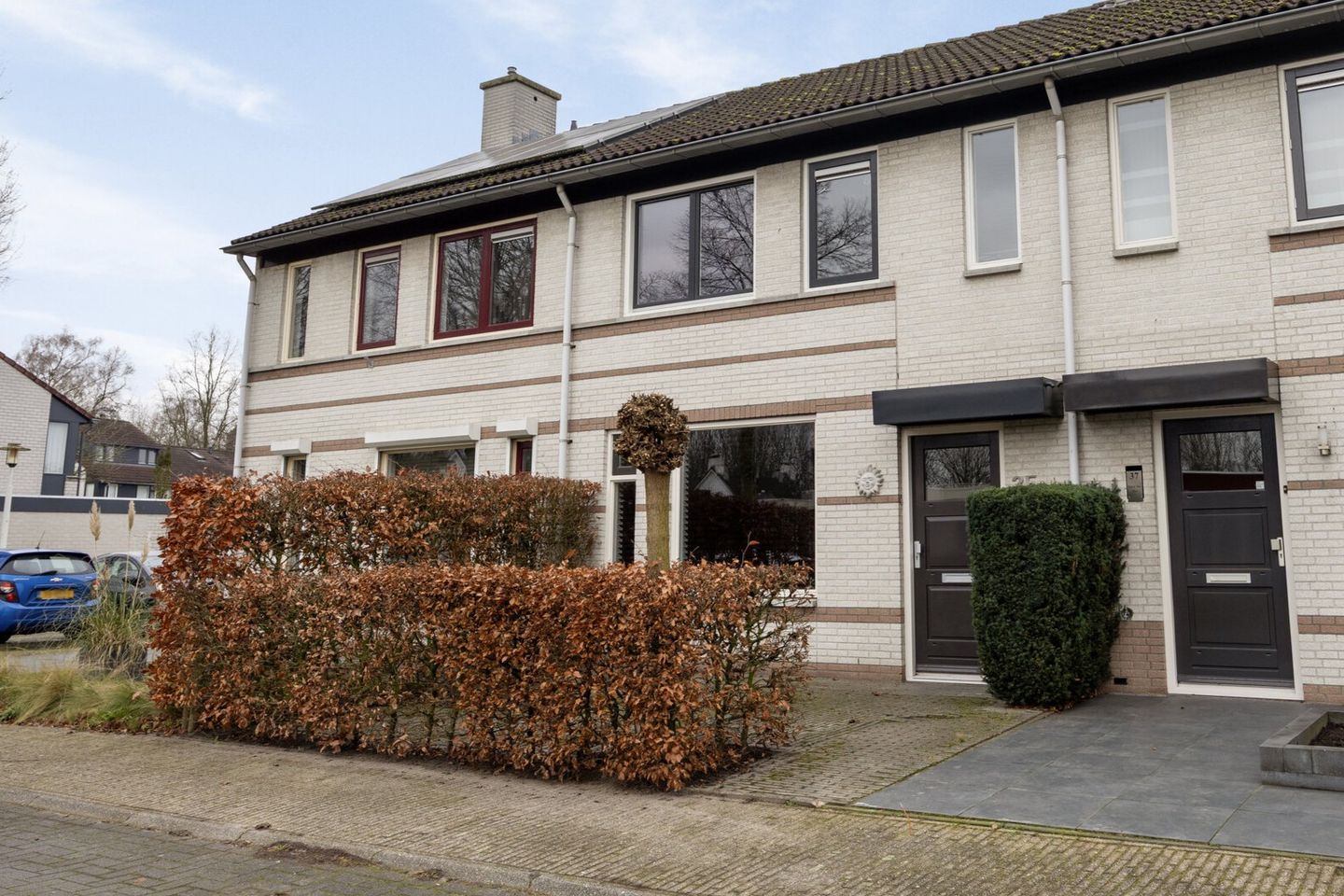 De voortuin van de woning is onderhoudsvriendelijk aangelegd met sierbestrating, een border en beukenhagen op de erfgrenzen.