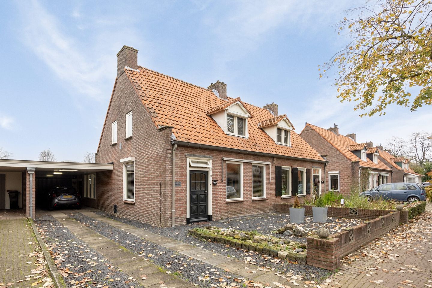 De nette en ruime voortuin van de woning is onderhoudsvriendelijk ingericht met siergrind, tegelbestrating en voorzien van een lage stenen omheining. Naast de woning is een uitermate diepe oprit te vinden met parkeerplek voor meerdere auto’s op eigen terrein. Ook is er een grote, praktische carport aanwezig met lichtkoepel en verlichting.