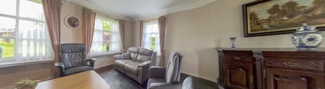 Een half open doorloop vanuit de keuken leidt naar de royale woonkamer. Deze woonkamer van ruim 42 m² biedt voldoende ruimte voor een zithoek aan de voorzijde en een eethoek aan de achterzijde. De pelletkachel aan de voorzijde en de ramen met roedeverdeling geven het geheel een sfeervolle uitstraling. Op de vloer ligt een natuurstenen tegelvloer.