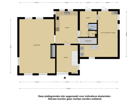 Terug via de keuken is een portaal te bereiken met daarop de meterkast en het toilet. Tevens is hier een loopdeur rechtstreeks naar de achtertuin. Achter het portaal is nog een multifunctionele ruimte gelegen. Deze kan worden gebruikt als een thuiskantoor, of voor een beroep aan huis, maar ook een speelkamer is hier denkbaar. In deze ruimte bevinden zich de aansluitingen voor de wasmachine en droger.