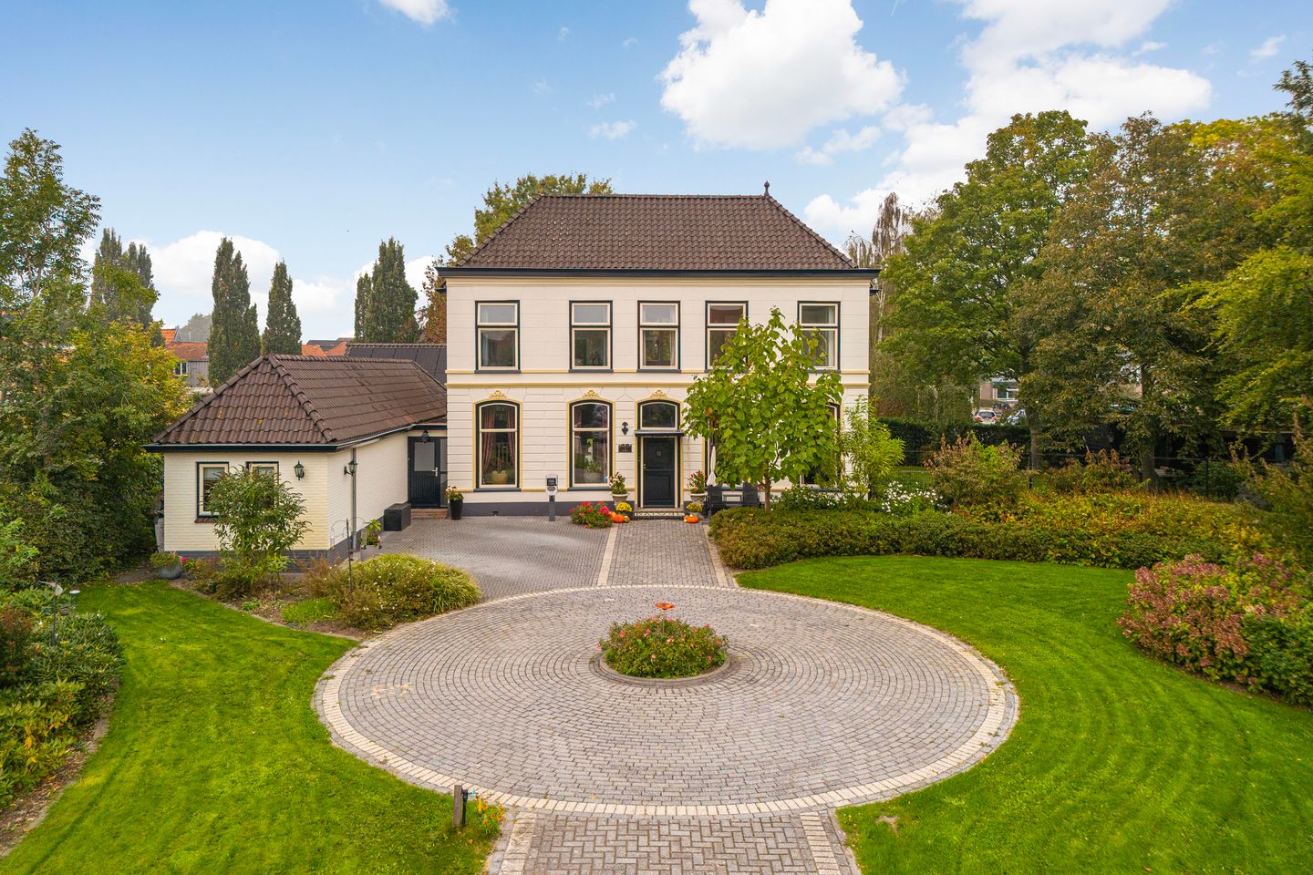 Het perceel van 2.095 m² vormt een groene enclave midden in het dorp. De fraaie voortuin met monumentale bomen en ronde oprit markeert de entree. De tuin loopt aan de rechterzijde om het huis heen en is diep en beschut, met gazons, terrassen, volwassen bomen en borders die privacy bieden. Tussen voor- en achtertuin is recent een hekwerk geplaatst, zodat huisdieren vrij kunnen rondlopen. De oprit biedt ruimte aan meerdere auto’s en geeft toegang tot het bijgebouw.