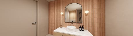 - Douche, toilet, vloerverwarming, wastafel, en wastafelmeubel