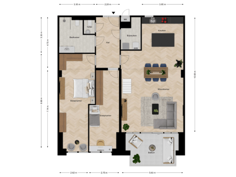 De grootste slaapkamer is ruim opgezet, met voldoende plek voor een bed, kastenwand en eventueel een kleedhoek. De tweede kamer kan worden ingericht als logeer- of werkkamer. De badkamer is royaal en slim ingedeeld, met daarnaast een separaat tweede toilet. De inpandige berging van circa 5 m² is praktisch voor extra opslag.
