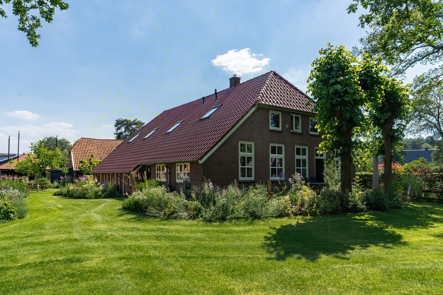 Vanuit deze goed onderhouden woning kijkt men over de weilanden naar het iets verder gelegen bos. Op het erf met oude eiken staan meerdere opstallen waaronder een gastenverblijf en een grote schuur welke nu gebruikt wordt als atelier en berging.