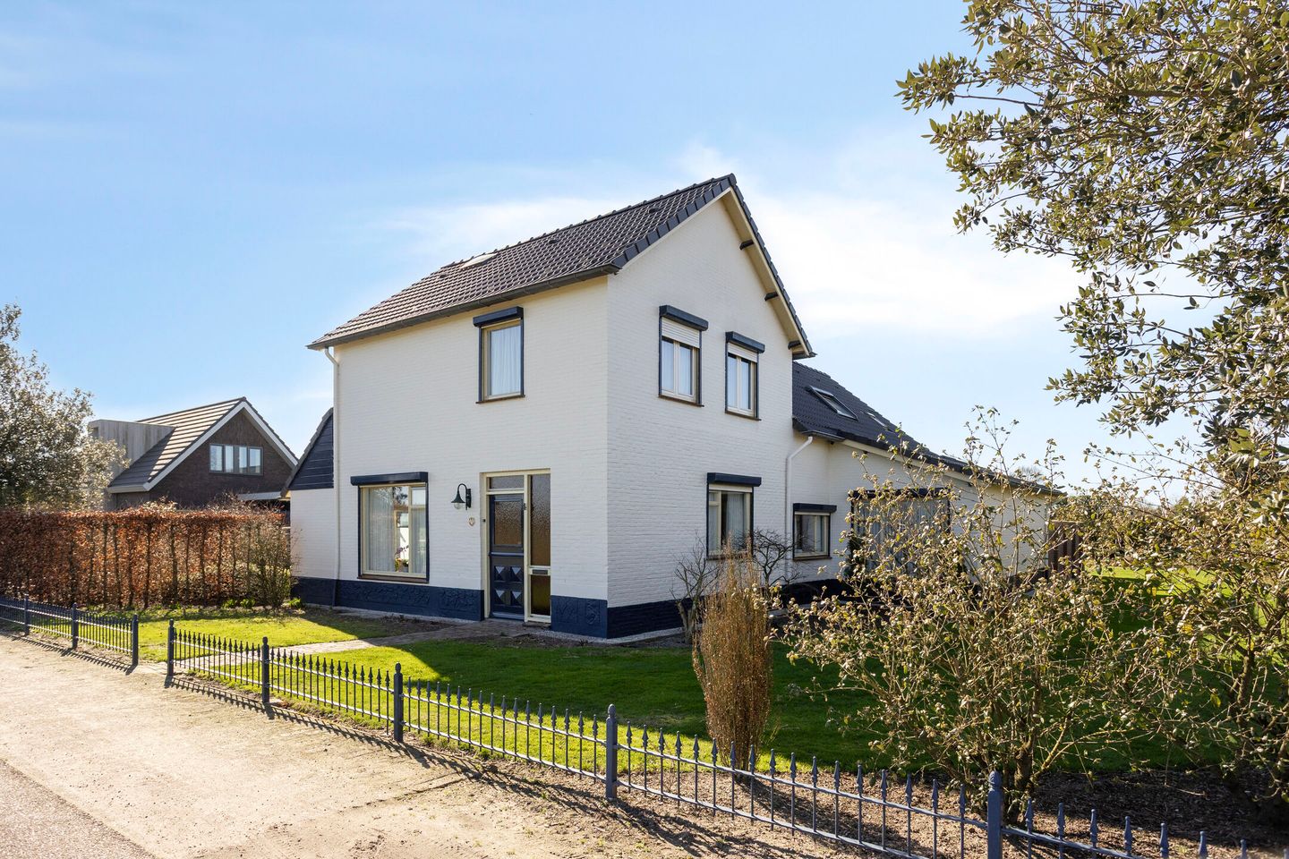 Direct aan de voorzijde van het bijgebouw en links van de woning, biedt de grote oprit parkeerplek op eigen terrein voor meerdere voertuigen. De oprit is afsluitbaar middels een stijlvolle stalen, dubbele sierpoort aan straatzijde (op afstand bedienbaar).