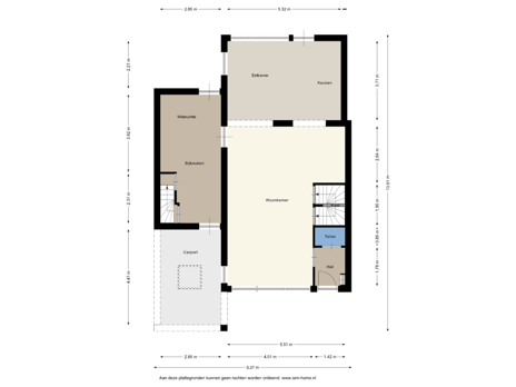 Via de woonkamer is er toegang tot de bijkeuken met inbouwkast, aansluitingen voor wasmachine en droger, een werkblad met spoelbak en mengkraan, en toegang tot de tuin en carport.