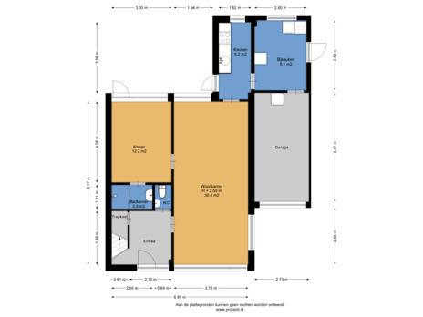 Indeling: entree/hal, toilet, trapkast, (doorzon)woonkamer, dichte eetkeuken, bijkeuken met toegang tot de aangebouwde garage, slaapkamer, doucheruimte.