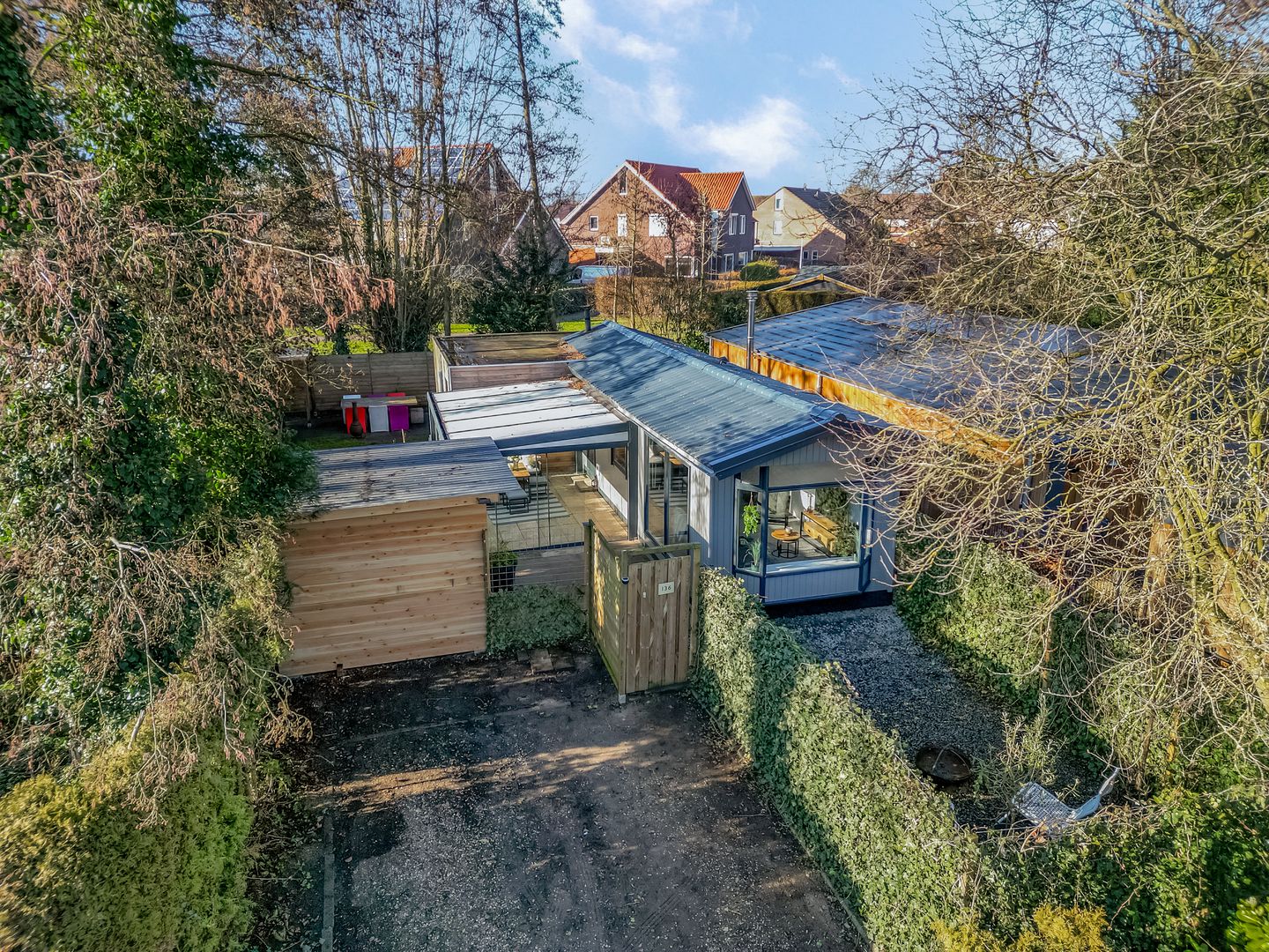 De woning is omgeven door een besloten perceel. Met heerlijk veel privacy geniet je hier van je eigen domein. Met een gazon, verschillende terrassen en de tuin op het zuiden, is het hier iedere dag genieten! Ook parkeren is geen probleem: je eigen parkeerplaats ligt direct voor de woning.