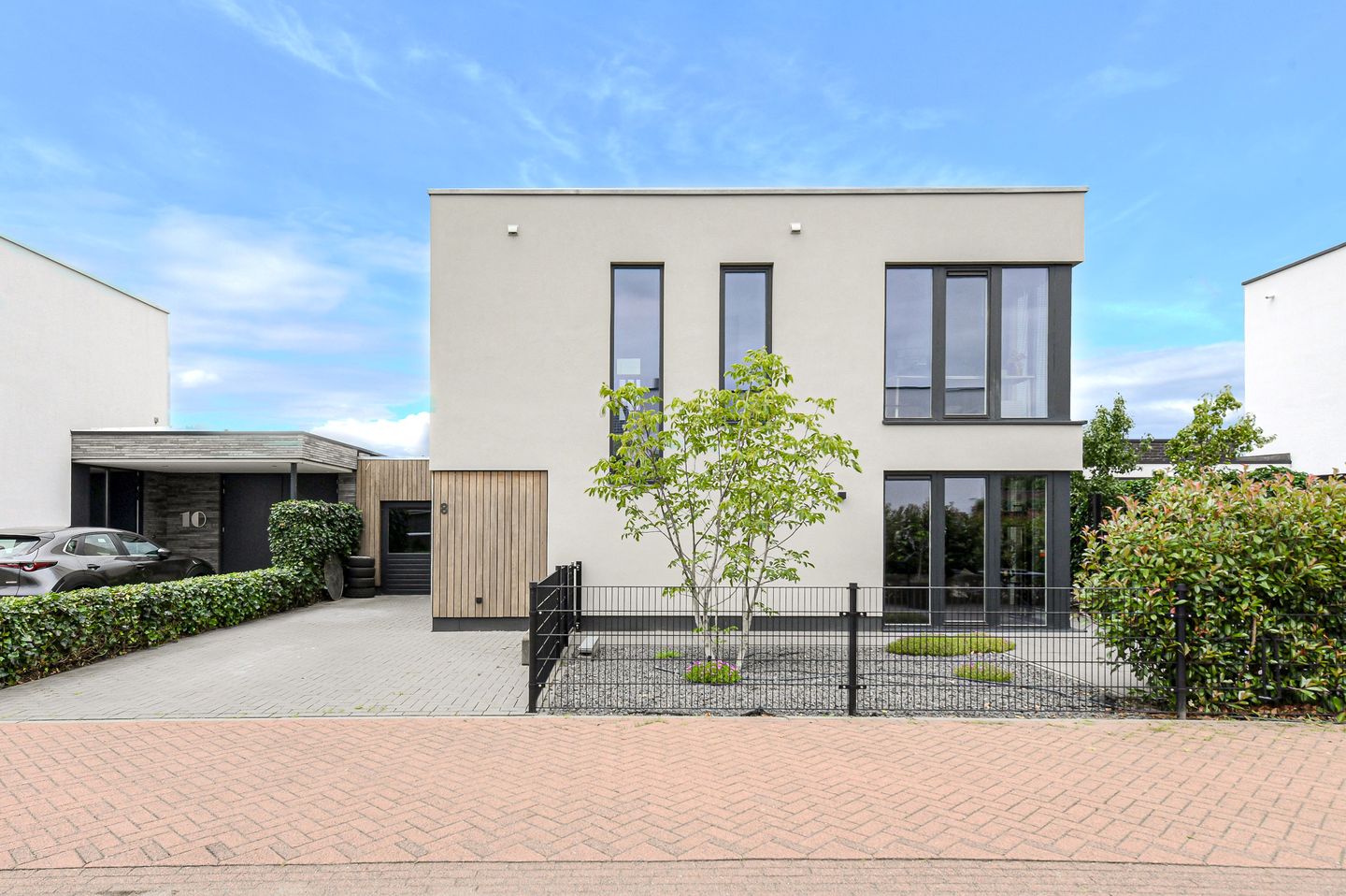 Rondom de woning is de tuin in strakke lijnen aangelegd met voor elk moment van de dag zonnige zitplekken.