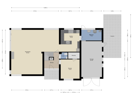Praktische bijkeuken met aansluitingen ten behoeve van de wasapparatuur, opstelplaats van de binnenunit van de Daikin warmtepomp en een loopdeur naar buiten. Vanuit de bijkeuken is er verder inpandige toegang tot de grote garage met openslaande deuren naar de oprit en een loopdeur naar de naar de naastgelegen carport. In de garage bevindt zich de set van 5 thuisbatterijen (ter overname) van Sessy met een totale opslagcapaciteit van maar liefst 25KW.