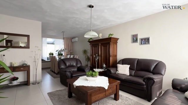 Entree/hal met meterkast, lux afgewerkte toiletruimte met een vrijhangend closet en een fonteintje. Speels opgezette woonkamer met half-open keuken van in totaal ca. 44m² voorzien van een lichte tegelvloer, schuifpui naar de op het zuiden georiënteerde afgesloten voortuin en een loopdeur naar de aan de keukenzijde gelegen 'achtertuin'. De woonkamer is verder voorzien van een comfortabele airconditioning. De keuken is ingericht met een hoek-opgestelde keukeninrichting met diverse kastruimte en de navolgende inbouwapparatuur te weten: gaskookplaat, rvs-afzuigschouw, combi-magnetron, koelkast en een vaatwasmachine.