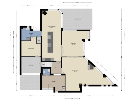 Aan de achterzijde van de woning is de eetkamer van ca. 21m2 gesitueerd, deze is eveneens voorzien is van een prachtige houten vloer. Vanuit de eetkamer zijn er twee schuifpuien die toegang geven tot de tuin. Een biedt er toegang tot het op het zuiden gelegen terras en een geeft toegang tot het grote aangebouwde en overdekte terras. Het is hier heerlijk zitten tot in de late uurtjes! De eetkamer grenst direct aan de woon/eetkeuken en is door middel van fraaie stalen pui met dubbele openslaande deuren af te scheiden.