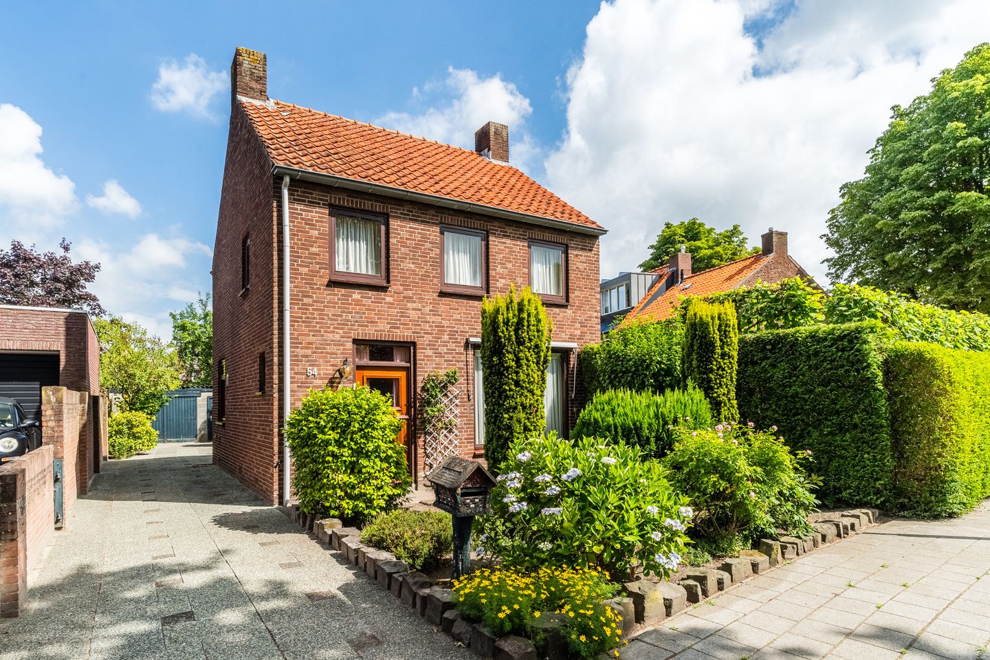 Zowel aan de voor-, zij- en achterkant van de woning is een aangelegde tuin aanwezig. De achtertuin met achterom heeft direct aan de woning een groot terras met aansluitend een stenen berging (voorzien van elektra en gas). Twee naast elkaar achter op het perceel gelegen eenvoudige garage's. De tuin aan de zij- en voorkant is omsloten door een groene haag. In de tuin treft u diverse beplanting aan. Naast de woning ligt een oprit die u toegang geeft tot de garage. Op deze oprit kunt u gemakkelijk een auto parkeren.