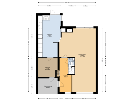 - 90 m² (10,00 meter diep en 9,00 meter breed)