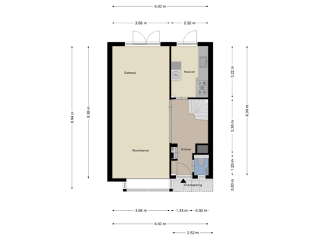 De overdekte entree geeft toegang tot de hal met meterkast, toiletruimte met zwevend closet en fonteintje, alsmede een trapopgang naar de eerste verdieping. Vanuit de hal is de woonkamer en de keuken toegankelijk.