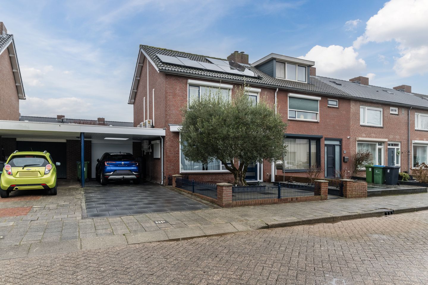 Aan de voorzijde heeft u een fraai aangelegde tuin met een prachtige olijfboom. Wat betreft parkeren, naast de eigen garage, zijn er ook openbare parkeerfaciliteiten en ruimte voor het parkeren op eigen terrein met een capaciteit voor 2 auto's. Voor de garage is een carport aanwezig waar 1 auto onder past. De nette verwarmde garage beschikt over een elektrische sectionaal deur.