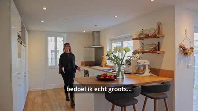 De ruime hal verwelkomt je met een handige trapkast en een modern toilet. Vanuit hier loop je de lichte woonkamer in, met grote raampartijen die zorgen voor een fijne verbinding met buiten. De sfeervolle openhaard geeft warmte en karakter, maar ook via de vloerverwarming heb je altijd een comfortabel klimaat in huis. Via de eethoek, perfect gepositioneerd voor lange diners en gezellige borrels, kom je in de halfopen keuken, compleet met inbouwapparatuur. Vanuit de keuken is ook de garage/bijkeuken bereikbaar. Hier zul je 9 van de 10 keer binnen komen lopen om je tassen neer te zetten en je jas en schoenen uit te trekken. Zo wordt deze ruimte een ideale ruime hal waar je alles makkelijk kunt bergen.