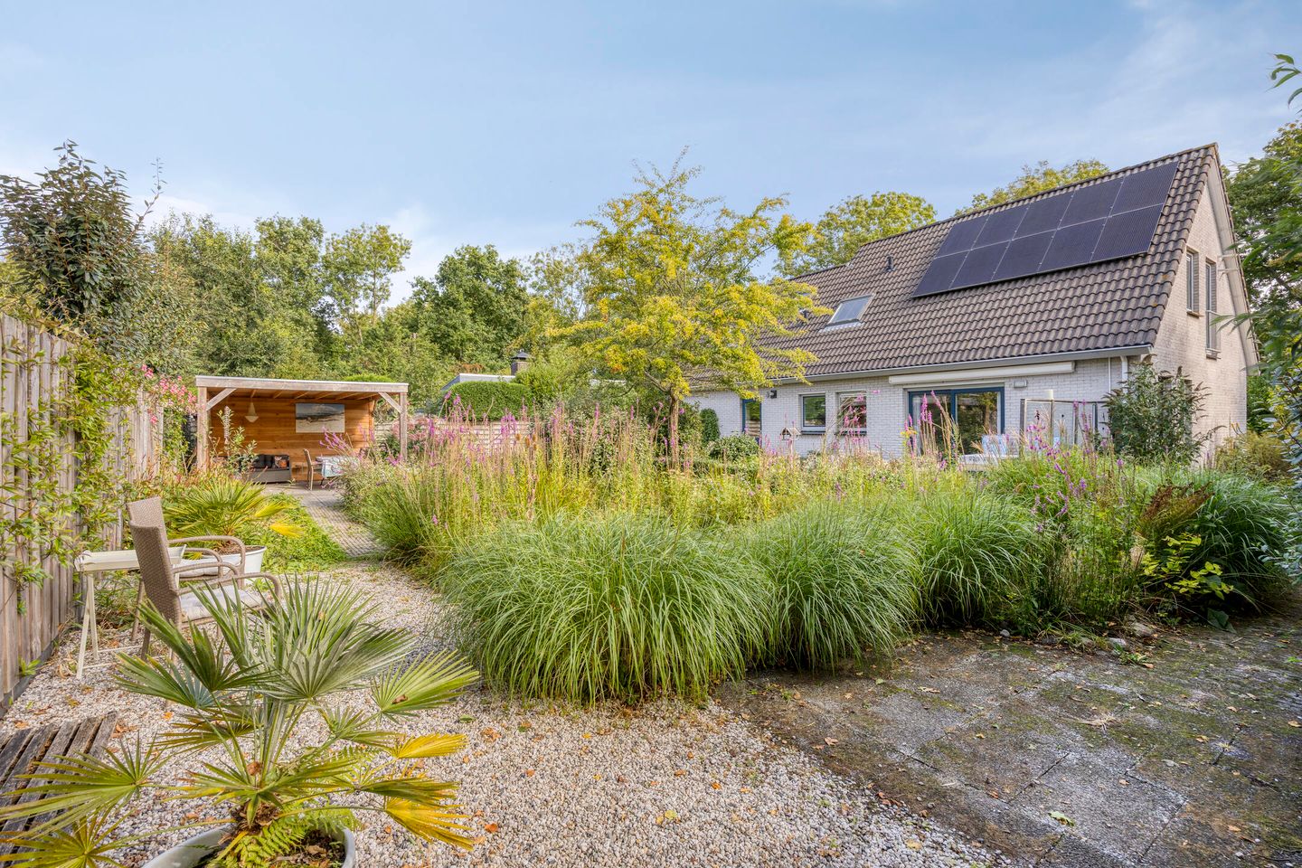 De achtertuin is een groene oase met diverse bloemen, planten en struiken, een vijver en meerdere terrassen. Dankzij de ligging op het westen geniet u hier ’s avonds van de laatste zonnestralen, bijvoorbeeld op het terras direct achter de woonkamer. De overkapping biedt een fijne plek in de schaduw of beschutting.