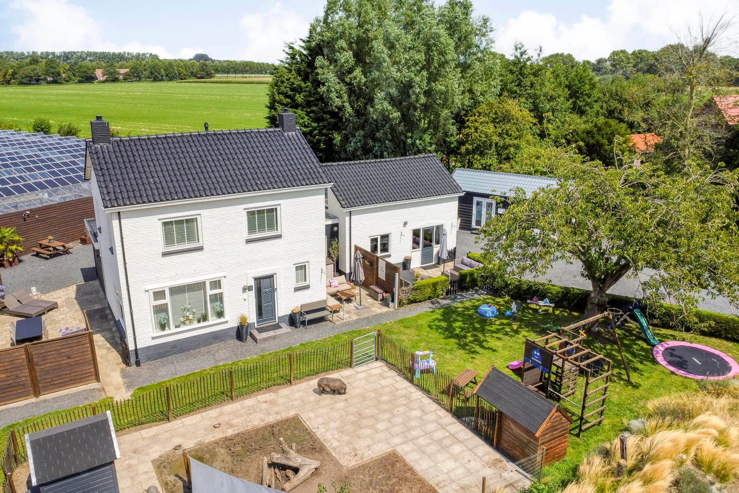 Het perceel met eigen oprit biedt plaats voor het parkeren van een tal van auto's. Verder is de tuin zeer kindvriendelijk aangelegd met diverse speeltoestellen en een kleine 'kinderboerderij' deze wordt tevens aan de zomerwoning aangeboden. Voor meer privacy kunt u zich terug trekken in de zijtuin met groene omzoming en terras met altijd een plekje in de zon of in de achtertuin.
