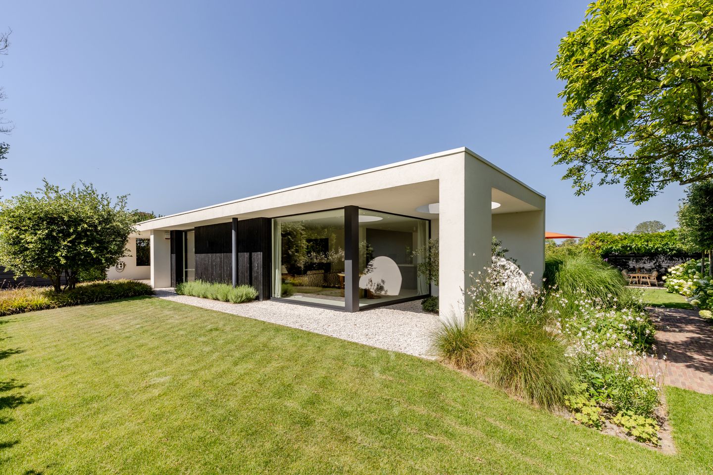 Deze moderne bungalow wordt omgeven door een prachtig ontworpen tuin (2025). De tuin is gevuld met weelderige siergrassen en verschillende bloemen en planten.