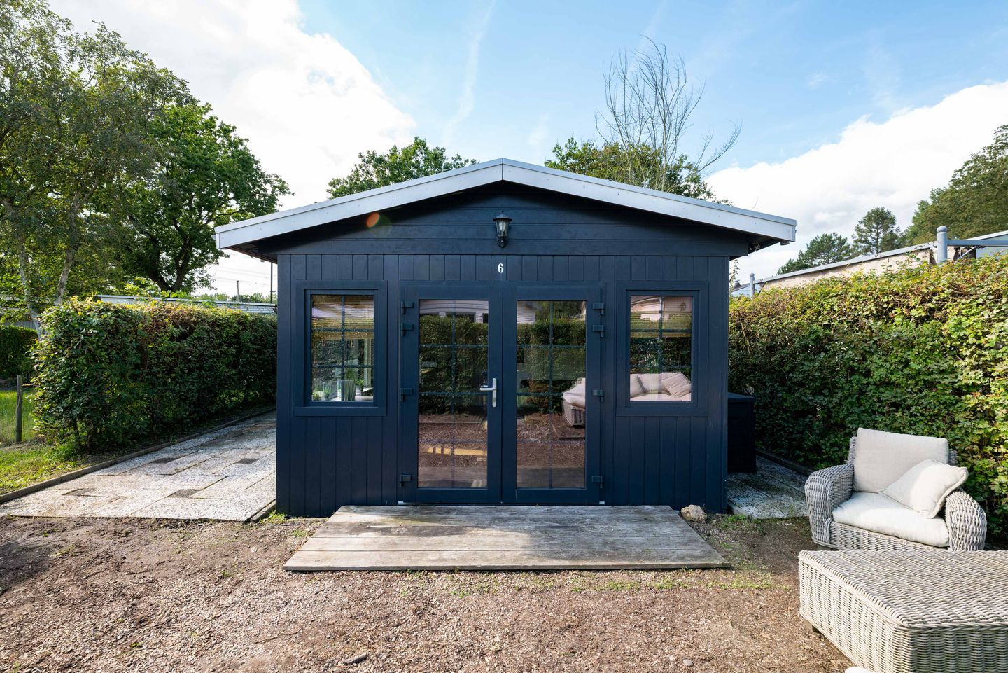 De woning heeft voor de woning een terras met loungehoek; een 2e terras met barbecue naast de woning en een tuin voorzien van een gazon.