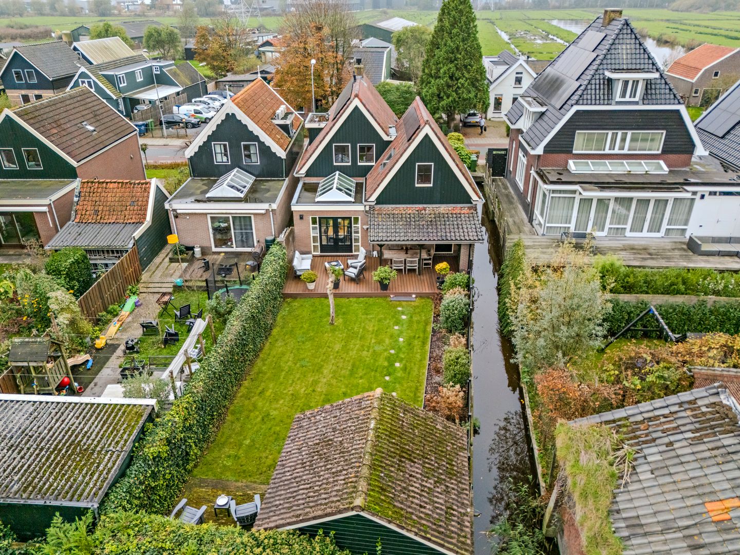 De kindvriendelijke achtertuin is een heerlijke plek voor het hele gezin, met een afsluitbaar gedeelte bij het water, zodat kinderen veilig kunnen spelen. Het water biedt bovendien een unieke kans: vanaf hier kun je via de Zuidwestplas en het Noordhollandsch Kanaal, zelfs naar Amsterdam varen. ’s Ochtends word je gewekt door het rustgevende geluid van blatende schapen, die net achter de tuin grazen, wat een echt buitengevoel geeft. De tuin is praktisch ingericht met een ruime blokhut welke is gefundeerd en voorzien van elektra, perfect voor extra opslag of als hobbyruimte. Het onderhoudsvrije terras, gemaakt van duurzame composiet planken is deels overkapt en zorgt voor een gezellige uitstraling. De gehele tuin is voorzien van sfeervolle verlichting, waardoor je ook ’s avonds volop van de tuin kunt genieten.