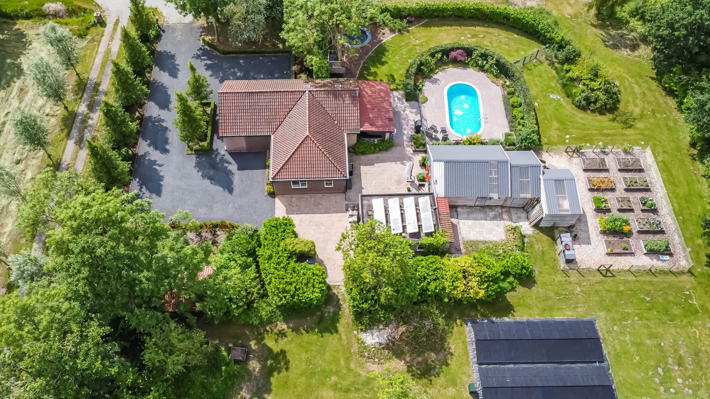Vrijstaand wonen met rust, ruimte én een zwembad op 7.900 m² eigen grond Op zoek naar vrijheid, comfort en een landelijke ligging met alle voorzieningen binnen handbereik? Deze vrijstaande semi-bungalow op een riant perceel van maar liefst 7.900 m² biedt het allemaal. Kenmerken: - Vrijstaande semi-bungalow - 7.900 m² perceel - 36 zonnepanelen (energielabel A) - Zwembad met overkapping - Grote garage, meerdere schuren en moestuin - Snelle verbinding naar A7, 10 minuten van Drachten Indeling Begane grond Je stapt binnen in een ruime hal met plavuizenvloer, inloopkast en een net toilet. Rechts vind je de lichte, L-vormige woonkamer met een stijlvolle PVC-visgraatvloer en grote ramen die zorgen voor een prettige lichtinval. De halfopen keuken sluit hier mooi op aan en is van alle gemakken voorzien: een fornuis met dubbele oven, schouwkap, vaatwasser en een aparte magnetron. Via de gang kom je bij twee ruime slaapkamers, waarvan één met een walk-in-closet. De volledig betegelde badkamer beschikt over een ligbad, aparte douche en wastafelmeubel. In de praktische bijkeuken vind je de cv-opstelling en aansluitingen voor de wasmachine en droger. Vanuit hier loop je zo de tuin in. Eerste verdieping De bovenverdieping biedt een gezellige kinderslaapkamer met bergruimte. Door de kapvorm is de stahoogte wat beperkt, maar dat geeft juist een knus en speels gevoel. Buitenleven met een plus De tuin is echt een droomplek. Er is een grote, vrijstaande stenen garage, meerdere schuren, een fraai aangelegde moestuin en volop ruimte voor kleinvee. En dan het absolute pronkstuk: een zwembad van 7 bij 3,5 meter met een ruime, overdekte loungeplek ernaast — perfect voor lange zomerdagen en gezellige avonden. Of je nu rust zoekt, dieren wilt houden of gewoon graag buiten leeft: hier vind je de ruimte én de vrijheid om jouw woonwensen waar te maken. Kom kijken en laat je verrassen! Benieuwd naar deze unieke plek? Maak snel een afspraak — we laten je de woning graag zien en vertellen je alles over de mogelijkheden!