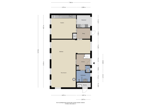 De eerste deur die je tegenkomt (in de zijgevel) is niet de entree naar de woning maar een inpandige berging, waar ook de CV-ketel (2003) hangt. De woning zelf betreed je via één van de twee deuren in de achtergevel, die beide uitkomen in een hal.