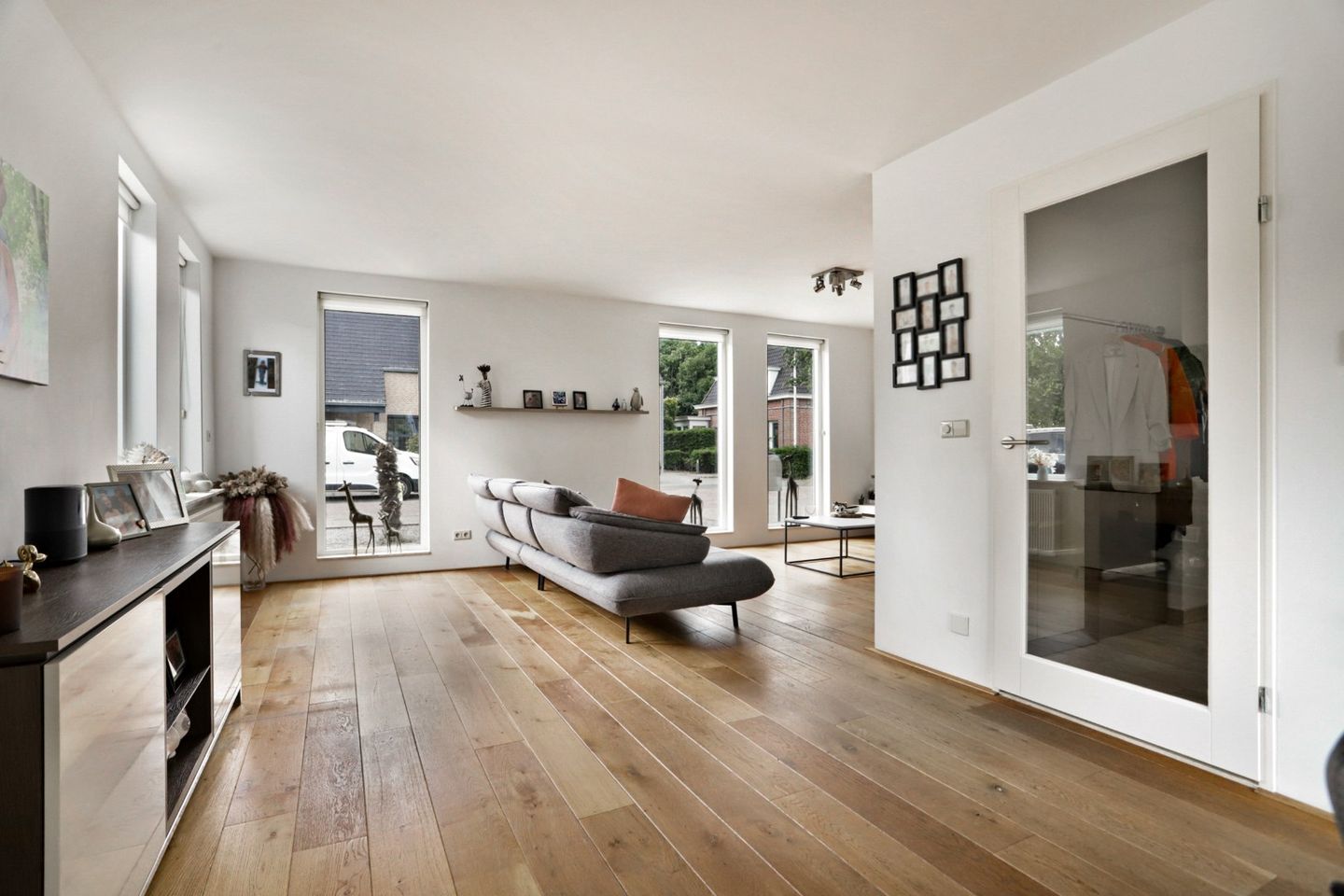 De woonkamer is ruim, licht en sfeervol, dankzij grote raampartijen en een schuifpui naar de tuin. Hier geniet u van het vrije uitzicht op groen, in een ruimte die uitnodigt tot lange avonden met familie en vrienden.