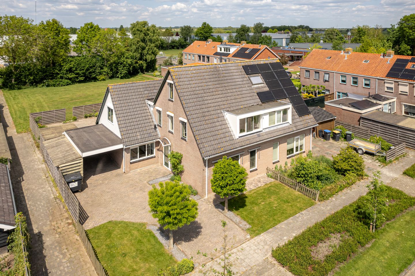 Buiten geniet je van een eigen carport met fietsenstalling en een vrijstaande houten schuur. De tuin is onderhoudsvriendelijk en grenst aan een speelveldje.