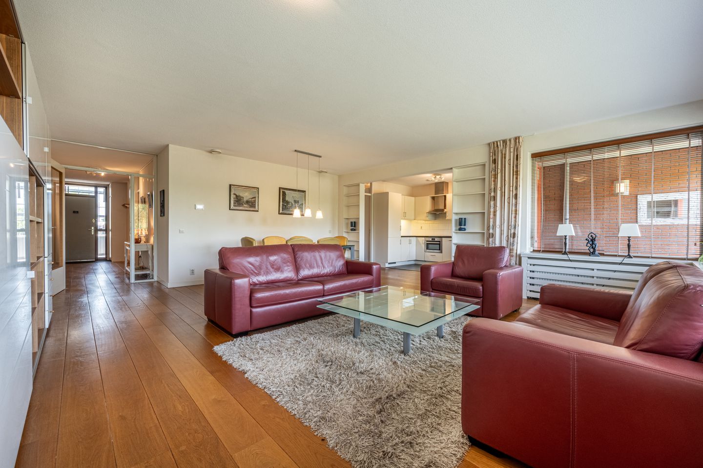 De woonkamer is afgewerkt met een neutrale houten vloer, wat bijdraagt aan de warme en rustige uitstraling. De radiatoren zijn daarbij stijlvol weggewerkt met moderne designombouwen, wat zorgt voor een strak en verzorgd geheel.