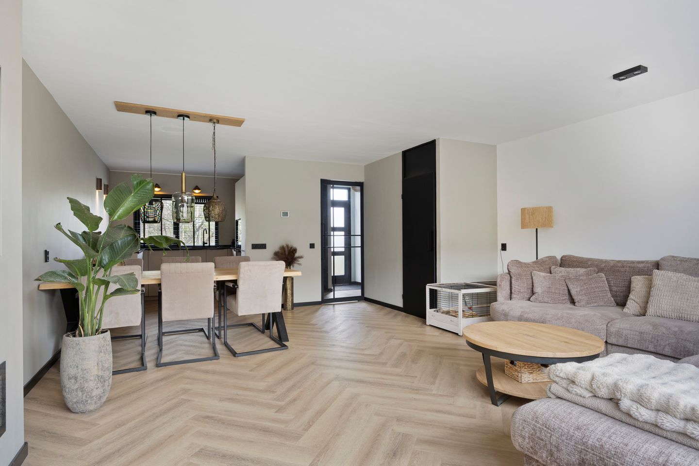 De woonkamer is voorzien van een prachtige visgraat pvc-vloer met vloerverwarming, wat zorgt voor een warme en luxe uitstraling. Aan de voorzijde bevindt zich de open keuken, terwijl de achterzijde via openslaande deuren toegang biedt tot de achtertuin.