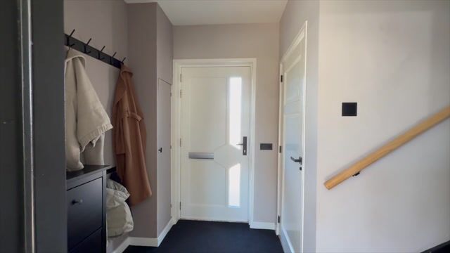 Hal/entree met de meterkast (11 groepen, 3 aardlekschakelaars en slimme meters), geheel betegeld hangtoilet met uitzetraam, trapopgang en een deur naar de woonkamer.