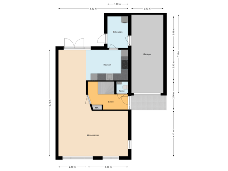 - Volledig betegelde bijkeuken met wasmachine-/droger aansluiting en deuren naar de tuin en naar de garage