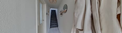 Laminaatvloer, trapopgang, radiator en meterkast.