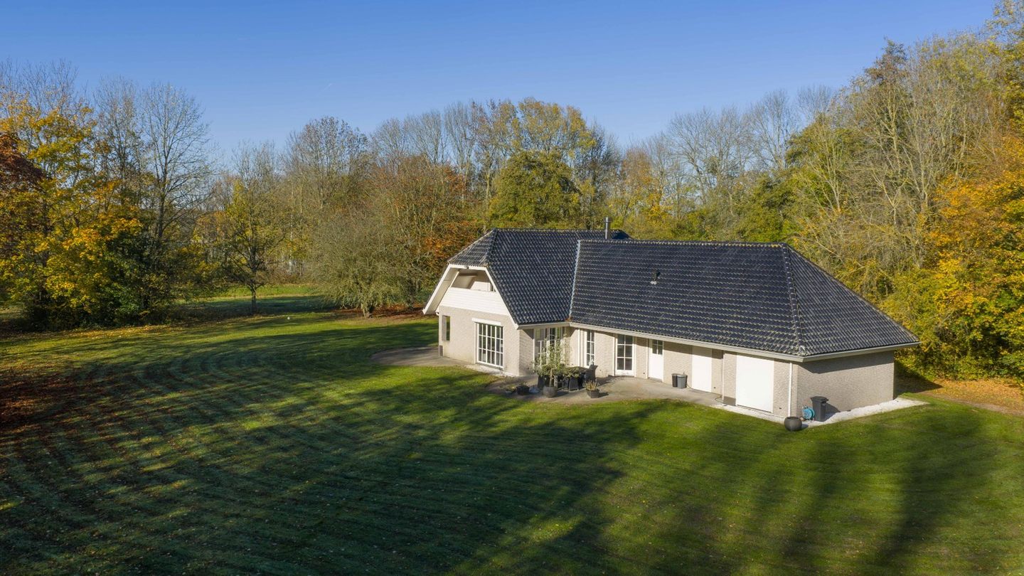 Op dit royale perceel van 23.550 m² eigen grond ligt, verscholen tussen volwassen groen, een karaktervolle vrijstaande semi-bungalow in L-vorm.