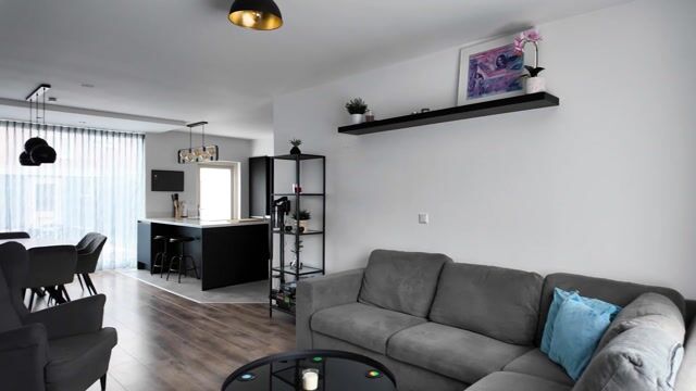 Ruime woonkamer met grote raampartijen aan voor- en achterzijde, dus veel lichtinval. Het zitgedeelte bevindt zich aan de voorzijde en het eetgedeelte aan de achterzijde, naast de keuken. Heerlijk licht door de grote ramen.